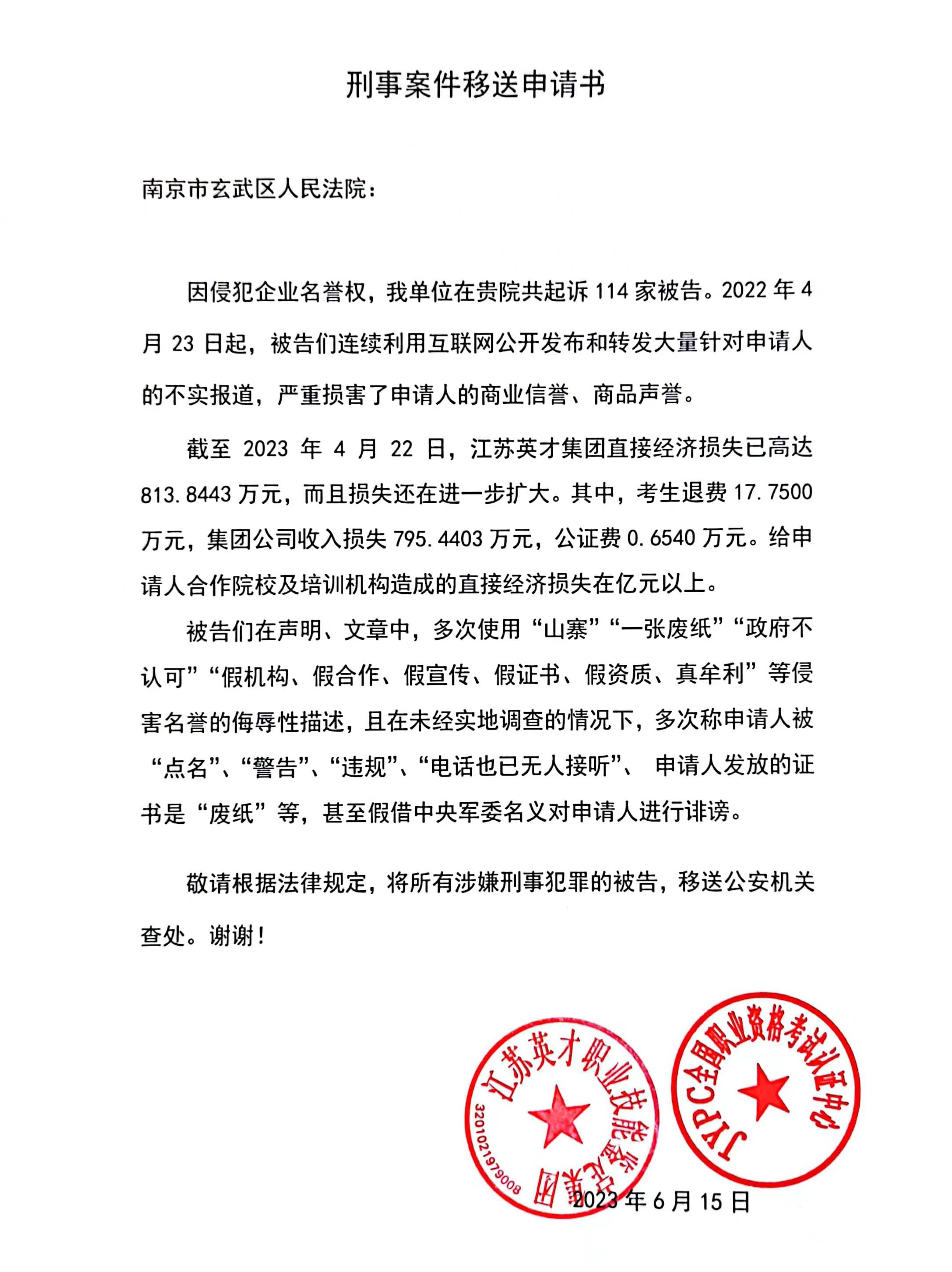 对此,2023年6月13日,江苏英才职业技能鉴定集团(JYPC全国职业资格考试认证中心)根据《中华人民共和国刑事诉讼法》第109条之规定,前往南京市公安局报案,并依据《中华人民共和国刑法》第221条的规定,以涉嫌损害商业信誉、商品声誉罪,请求依法追究这家公司和个人的刑事责任。